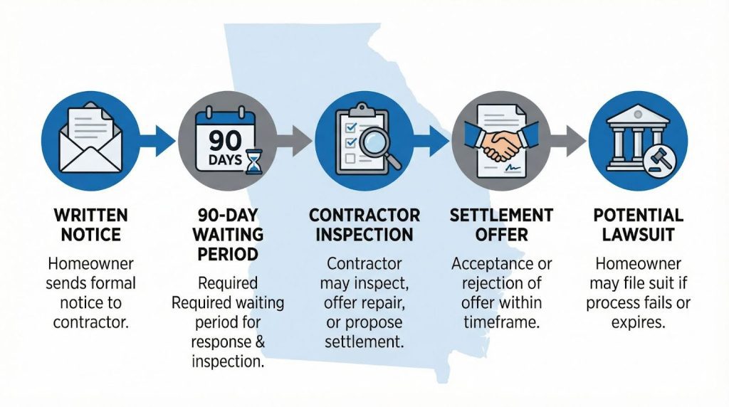 The Georgia Right to Repair Act sets out specific procedures homeowners must follow before filing a lawsuit over a construction defect in their home. Instead of going straight to court, you first have to serve written notice on the contractor and give them a chance to inspect the alleged defect and offer repairs or a settlement.